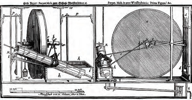 So back to the numbering clues in the Das Tri illustrations. Johann Bessler included an illustration showing the perpetual motion machine at Schloss Weissenstein. It was connected to an archimedes pump and apparently demonstrated its power to pump water. See the illustration below.